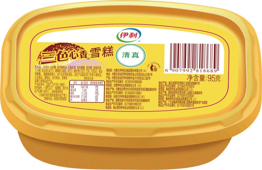 【商品名称】:伊利三色心香雪糕 【规格】:95g*27支*1箱【条形码】:6907992818689 【原料与配料】:饮用水、白砂糖、食用植物油、全脂乳粉、麦芽糊精、麦芽糖、食用葡萄糖、可可粉、乳清粉、乳化剂(471)、增稠剂(466、412)、着色剂(133、124、150d)、食品用香精。 【储存条件】:-22℃以下 【口味选择】:黄色的香草味+白色的鲜奶味+棕色(黑色)的巧克力味 【保质期】:18个月