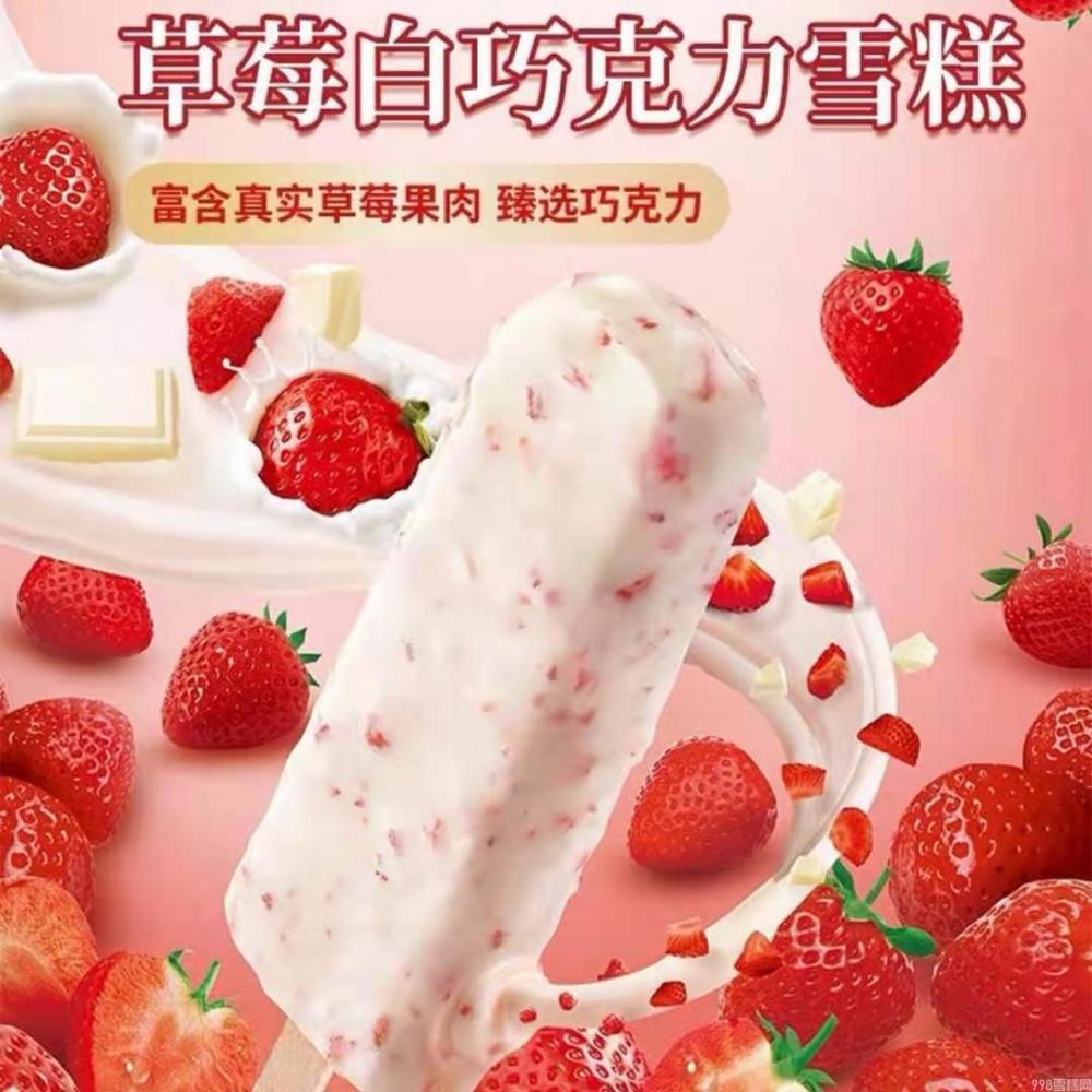 新鲜的草莓果粒,铺在香甜的白巧克力表皮中,包裹住富含真实草莓果肉且又酸甜可口的草莓雪糕,多重口感的融合,带来香甜诱人的美味享受。