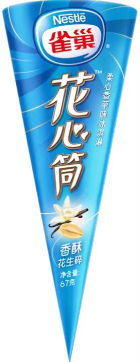 【商品名称】:雀巢花心筒香草口味雪糕 【口味选择】:香草味、巧克力味、蓝莓芝士蛋糕味 【规格】:67g*24支*1箱 【条形码】:6918551811485 【原料与配料】:饮用水、白砂糖、全脂乳粉、乳清粉、麦芽糊精、食用香精、增稠剂、添加剂、着色剂 【储存条件】:-22℃以下 【保质期】:18个月花心筒系列雪糕:华丽花头,流淌着巧克力酱配烤杏仁;焙香脆皮,包裹着双层口味的幼滑冰淇淋;内藏独特酱心或柔韧颗粒;巧克力的浓醇,香草的芬芳,芝士蛋糕的纯郁,任一口味的丰富组合,都给您带来完美感官之旅