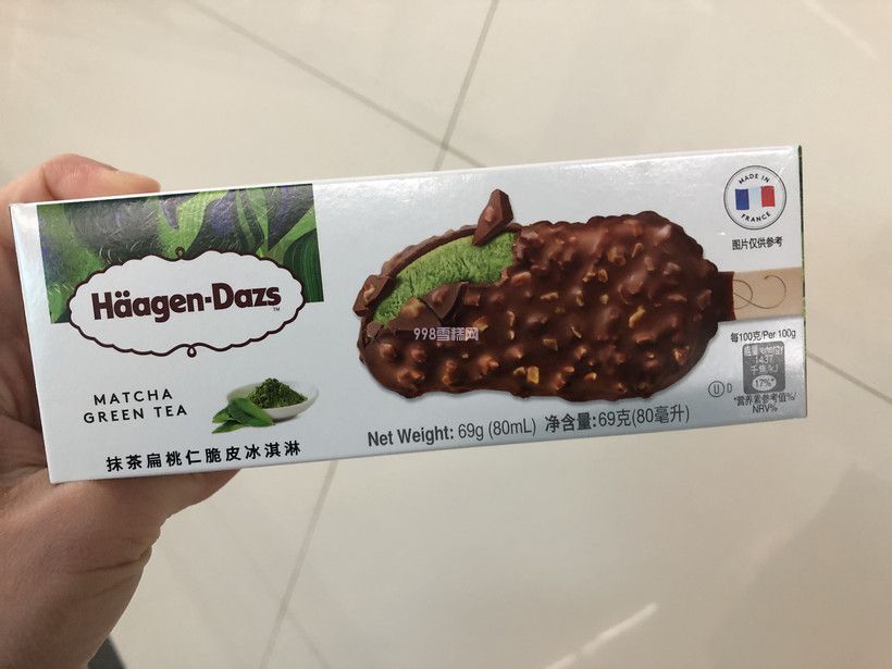 品牌: 哈根达斯(Haagen-Dazs) 商品名称:哈根达斯抹茶扁桃仁脆皮条冰淇淋 69g 商品编号:3235176 商品毛重:90.00g 商品产地:法国 热量:高(>300卡/100g) 脂肪含量:高(>23g/100g固体) 蛋白质含量:低(<5g/100g固体) 口味:草莓味 包装形式:单支装 净含量:300g以下 国产/进口:进口